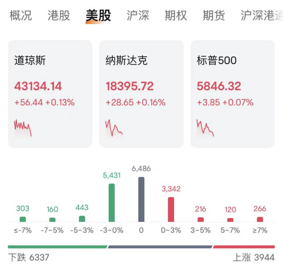 截至发稿(23:00),道指、纳指、标普500涨幅分别为0.13%、0.16%、0.07%。其中,道指创下盘中历史新高。