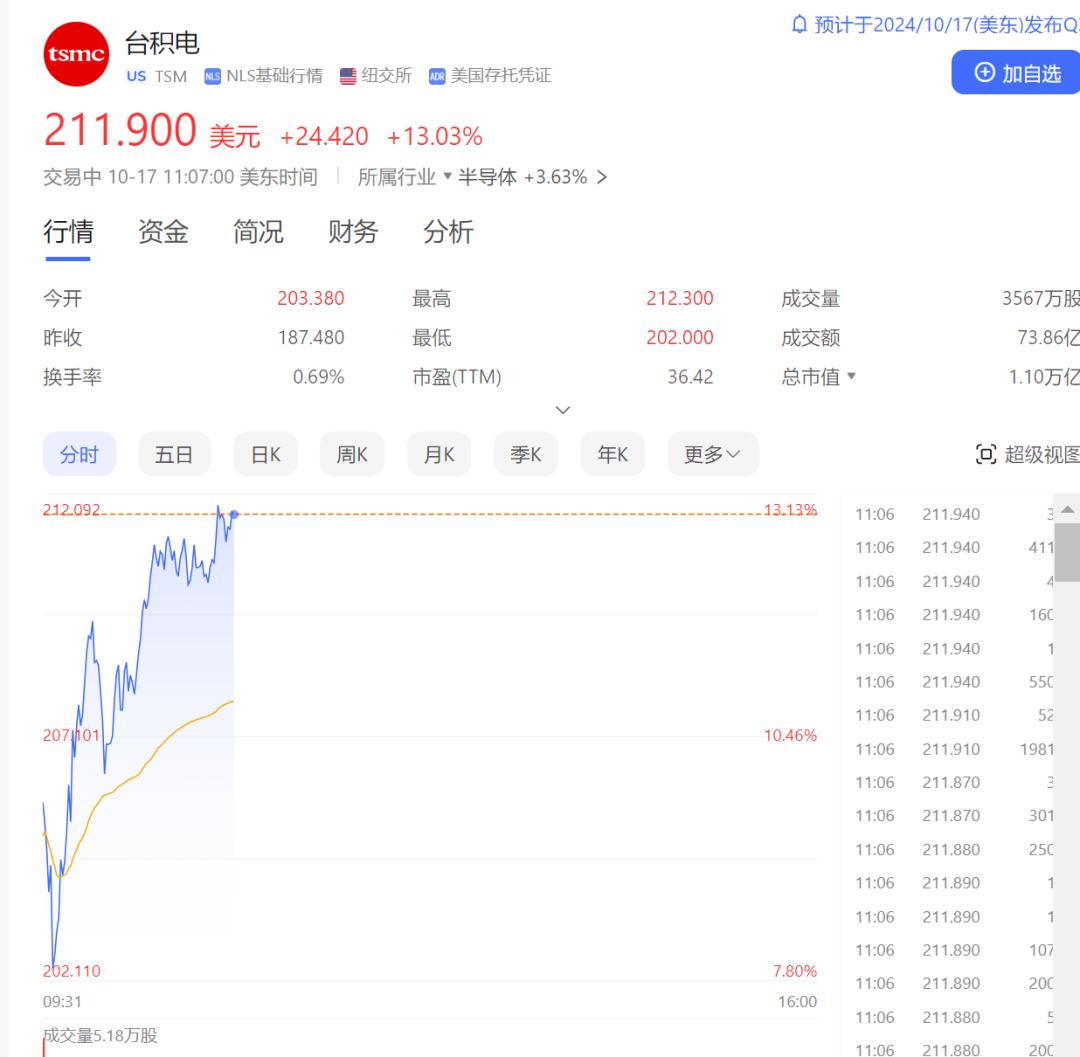 台积电涨超13%,最新股价超过211美元,创历史新高,总市值达1.1万亿美元,单日增加超1200亿美元(约合人民币8500亿元)。